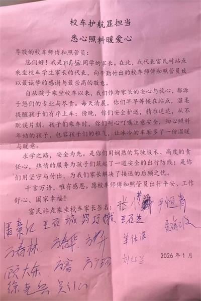 这封感谢信由富民村站点家长代表执笔,信中细数了校车服务的点点滴滴:每日清晨,校车师傅与照管员早早守候在站点,温柔提醒孩子们有序上车;傍晚时分,又将孩子们安全、精准送达,从未耽误;行车途中,照管员耐心叮嘱安全事项,细心照料年幼学生,包容孩子们的稚气,让校车车厢充满温情。家长们在信中表示,正是工作人员专业的驾驶技术、高度的责任心和热情的服务,为孩子们筑起了安全出行的防线,也彻底解决了家长们接送孩子的后顾之忧。信的末尾,十多位家长郑重签下姓名,以此表达最诚挚的谢意。