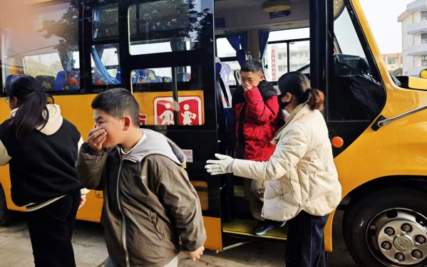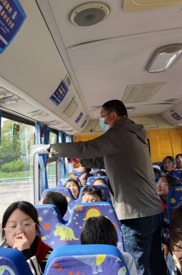 听到指令后,全体学生迅速解开安全带,严格按照“过道两侧先外后内、车厢座位先前再后”的疏散原则,分区域有序撤离:前四排学生从前车门快速疏散,后三排学生从应急逃生门撤离。撤离过程中,学生们纷纷用衣物紧捂口鼻、弯腰低身,快速且有序地撤离至安全区域。驾驶员坚守前车门位置引导学生疏散,随车照管员在应急门处做好防护疏导,对低年级、年龄较小的学生,照管员第一时间将其安全抱下车,全程分工明确、配合默契。